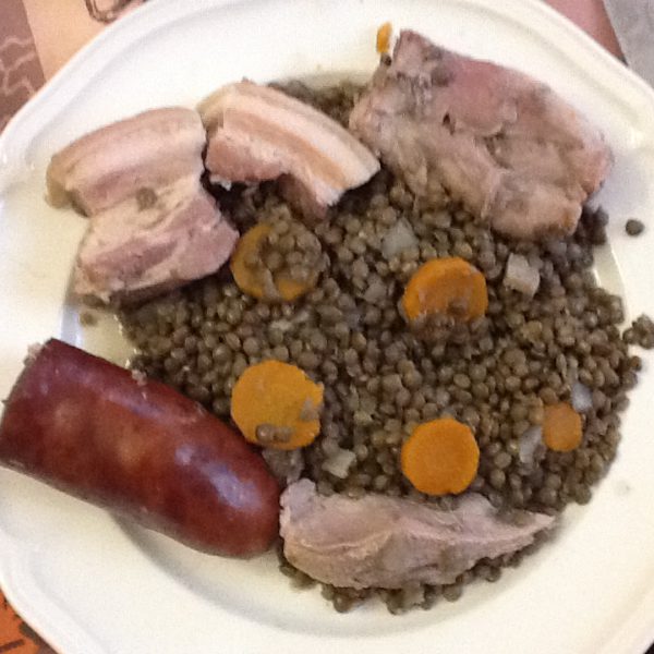 - A l'issue de la cuisson, égouttez les lentilles et leur garniture, dressez-les dans un grand plat. Ajoutez le jarret, la poitrine et les saucisses de Morteau coupées en tranches. Servez aussitôt.
