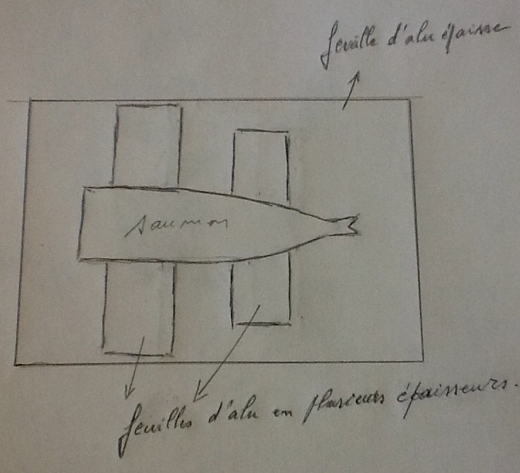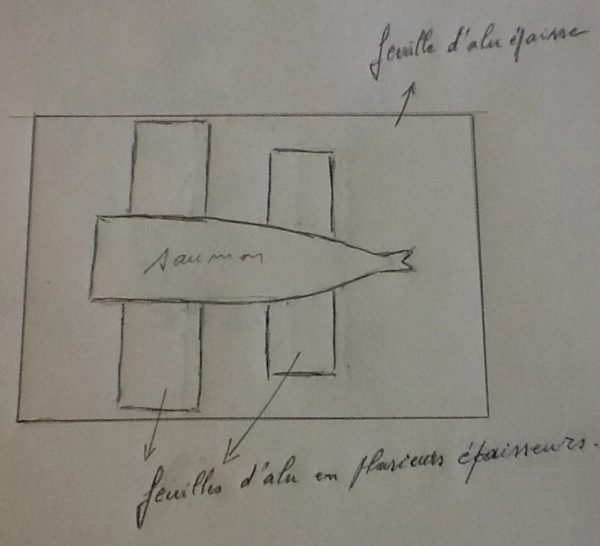 - Préchauffez le four thermostat 5 (150°C). Coupez la tête du saumon. Posez une grande feuille d'aluminium sur le plan de travail. Placez dessus 2 larges bandes d'aluminium dans le sens de la largeur. Huilez toute la surface. Saupoudrez de sel et poivre. Mettez le saumon au milieu et enfermez-le bien serré. Mettez la papillote à cuire pendant 60 minutes. Emballez également la tête dans une autre feuille d'aluminium huilée et ajoutez-la dans le four pendant 20 minutes avant la fin de cuisson.